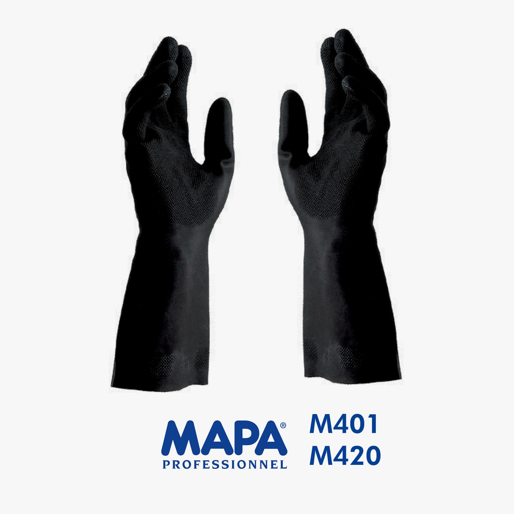 Neoprene. Interno fl occato in cotone per una ottima destrezza e comfort. Resistenza chimica polivalente per acidi, preparazione di colle, pulizia e manutenzioni industriali. M420 - Lunghezza 310mm / Spessore 0,55 mm