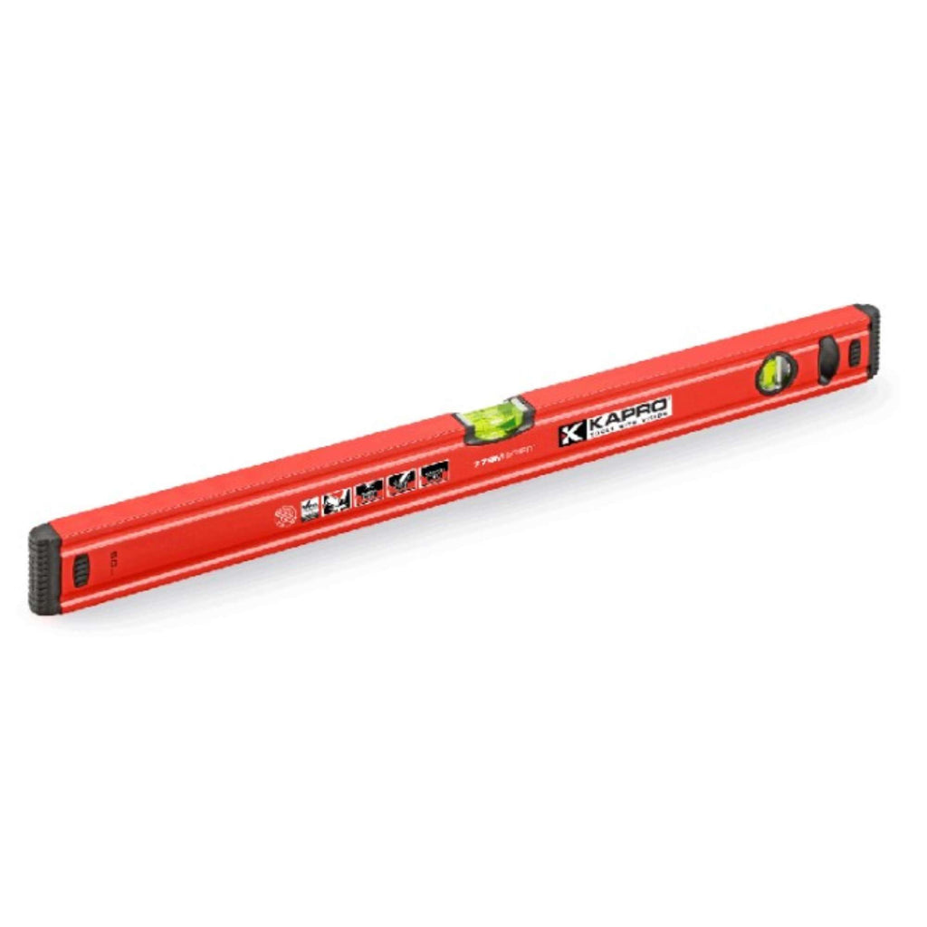 2 solide fiale in acrilico anti-urto: 1 orizzontale con indicazione della pendenza fino al 2% a bolla ingrandita e 1 verticale - Base rettificata (fino a 120cm di lunghezza livella) - Stopper gommati antiscivolo - Foro per appenderla - Inserti gommati para colpi.