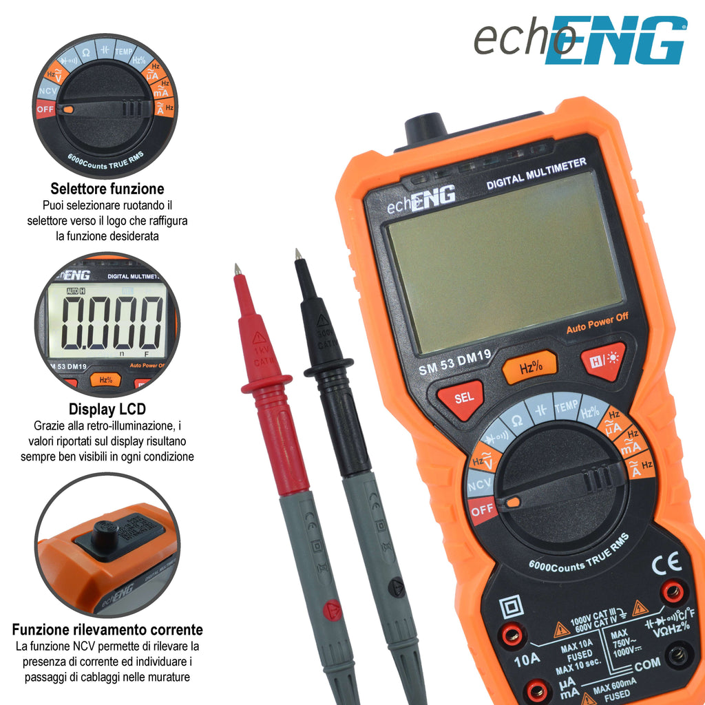 Multimetro Digitale Compatto – 6000 Conti TRUE RMS, Termometro Integrato, Misurazione Tensione AC/DC fino a 600V, CAT IV 600V / CAT III 1000V - echoENG SM 53 DM19