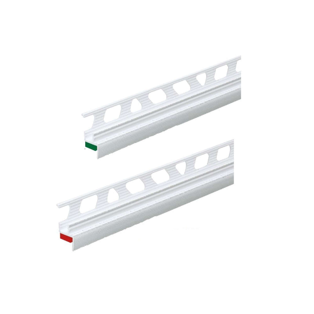 Profilo porta intonaco per la sigillatura del controtelaio, costruito con l’accoppiamento di un profilo in PVC speciale ed un materassino autoadesivo in polietilene espanso con 2 colorazioni (rosso e verde) caratterizzate da una permeabilità al vapore diversa: l’elasticità della spugna riesce a resistere a piccoli movimenti del muro evitando al formazione di crepe.