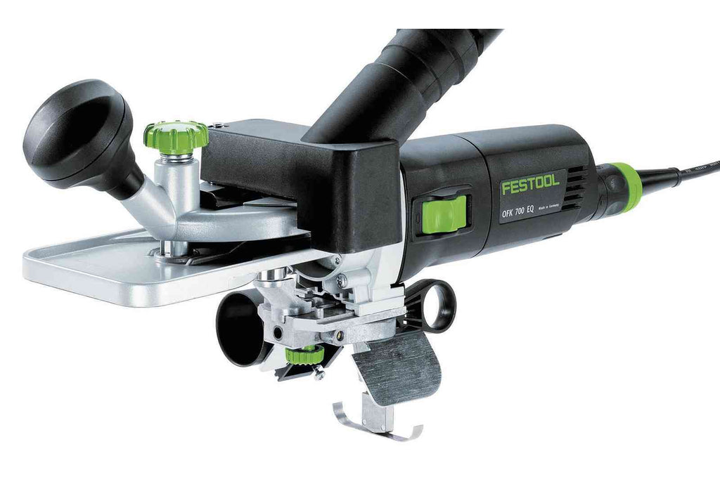 Convincente in rettilineo e in curva: l'OFK 700 è il multitalento tra i rifilatori. Rende la fresatura a filo di spigoli e superfici sporgenti un semplice esercizio. Non importa se il pezzo in lavorazione è di piccole o grandi dimensioni, se i bordi sono arcuati o rettilinei. L’ampio piano di fresatura, rapidamente orientabile, fornisce in ogni posizione di lavoro una superficie di appoggio stabile e una guida sicura della macchina.